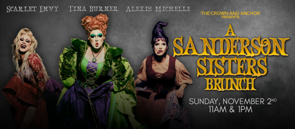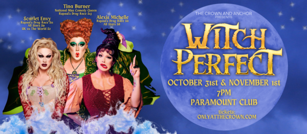 ATTENTION ALL VIRGINS, the Crown & Anchor requires assistance to ignite the black flame candle and summon the Sistahhhhhs! The hysterical award-winning spooktacular, Witch Perfect, is a live-singing, comedy parody based on the cult-classic and audience favorite Disney film, Hocus Pocus! Featuring Emmy-winning stars from RuPaul’s Drag Race: S13’s Tina Burner as Winifred, Season 11, All-Stars S6, and UK vs the World S2’s Scarlet Envy as Sara, and Season 9 and All Stars S8’s Alexis Michelle as Mary.